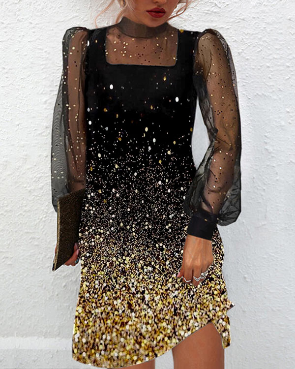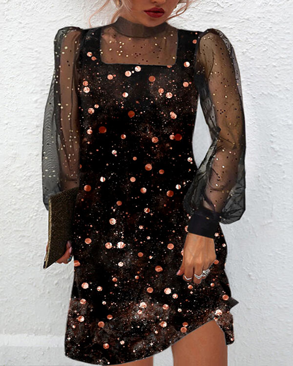 • Mesh Panel Printed Long Sleeve Stand Collar Dress
